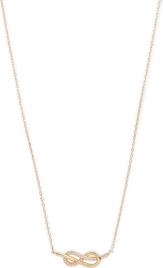 An elegant love knot sparkles with pavé cubic zirconia on this gleaming necklace plated in 18-karat gold.
