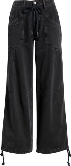 Rustic ties at the waist and hem add ease to these loose-fitting low-rise jeans.