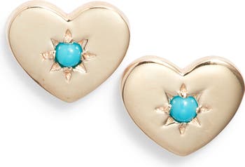 Turquoise cabochons burst at center of these romantic stud earrings handcrafted from 14-karat gold.