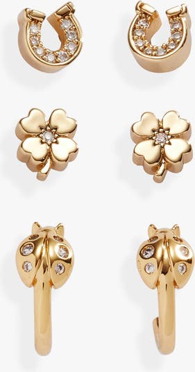 When you’ve got love and luck, you’ve got everything you need. This Love and Luck Set of 3 Stud Earrings and Huggie Hoops has three sets of crystal-accented lucky earrings: a set of horseshoes on posts, a set of four-leaf clovers on posts, and a set of ladybugs on huggie hoops. Wear them for a touch of good fortune, or combine them with other symbols that tell your story.