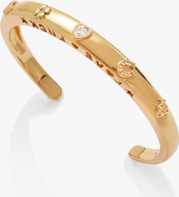 When you’ve got love and luck, you’ve got everything you need. This Love and Luck Domed Open Cuff Bracelet has five crystal-accented lucky symbols: a horseshoe, a four-leaf clover, a ladybug, a lock and a sparkling heart. It says “Love 🖤Luck” on the raised side. Wear it for a touch of good fortune, or combine it with other symbols that tell your story.