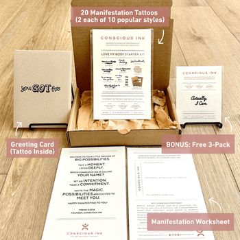 - Kit Includes: 20 Conscious Ink (2ea of 10 popular styles), 1 Tattoo Greeting Card, 1 Manifestation Worksheet, 1 Bonus Item.