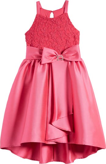 A bold bow marks the front of this precious kid-sized party dress with a shimmer-adorned bodice and a contrasting mikado skirt with perfectly placed gathers.