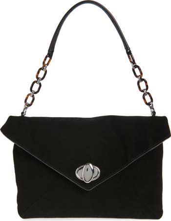 This classic envelope silhouette is updated with soft suede, a large turnlock closure and chain accents on the strap for an elegant update on a classic silhouette.