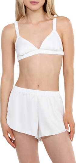 Lounge around in this stretchy set featuring a satin triangle bra and matching shorts with scalloped sides for flowy movement.