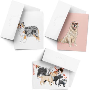- Card 1 artwork: Australian Shepherd with a love note, blank inside