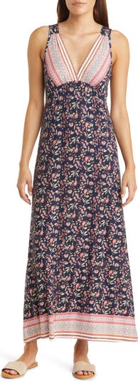 Breezy and sweet, this border-print maxi dress flatters with a surplice V-neck and gathered Empire waist.