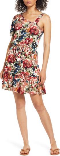 Lush blooms decorate a one-shoulder dress styled with a single strap and fluttery flounce hem.