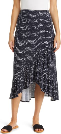 Tiny dots enliven this midi skirt finished with a tiered, flouncy hem.