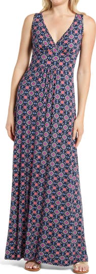 Make a splash at backyard parties in this colorful maxi dress knit from soft jersey with a fitted bodice and a flowing skirt.