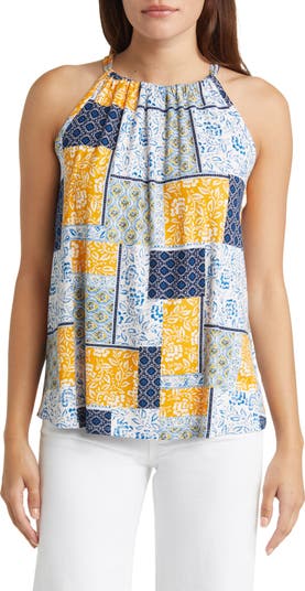 A patchwork of prints enlivens this drapey tank crafted with sleek cutaway shoulders.