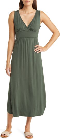 A dipped neckline tops this comfortable jersey midi dress cut in a sleeveless silhouette with a curved shirttail hem.