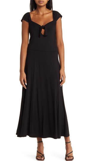 A tie in front enlivens this cap-sleeve knit dress fashioned with a full, swingy skirt.