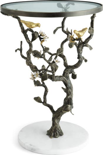 Bring a sense of nature to your favorite space with this accent table designed with two lovebirds perched upon carved branches featuring golden-trimmed enamel flowers. A smooth marble provides a weighted base so it sits firmly wherever you display it.