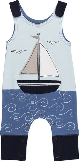 Scenic appliqués add charming detail to an organic-cotton romper designed with snap buttons for quick and easy changing.