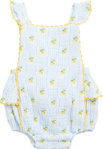 Your babe will be picture-perfect in an organic cotton romper splashed with a crop of lemons and trimmed with flouncy ruffles.