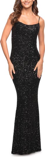 Lovely long soft sequin dress with scoop neckline and back. Back zipper closure.