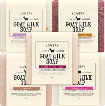 SOAP MADE WITH REAL ORGANIC GOAT MILK - Our goats milk soap bar selection is wonderfully blended with soothing scents and ingredients to nurture your skin the natural way. Each batch of goat soap is made using real organic goat milk. All natural bar soap producing a creamy, delicate lather. 5 SOOTHING & RELAXING SCENTS - Our goats milk bar soap is handmade and available in 5 exquisite scents: Oatmeal, Eucalyptus Lavender, Moroccan Vanilla, Hydrangea Rose, and Patchouli Sandalwood. All scents contain a base of ground oatmeal in the soap for gentle exfoliation. ORGANIC SHEA BUTTER & RICH NATURAL OILS – Hormone-free organic goat's milk soap made with organic Shea Butter, along with luxurious plant-based oils from coconut, soya, and olive. This rich goatmilk soap blend is deeply nourishing and leaves hands feeling silky smooth and clean. MOISTURIZING HAND SOAP FOR SENSITIVE SKIN - A goat milk soap bar containing REAL goat milk, not powdered. Our goat milk hand soap is carefully handcrafted for sensitive skin care and moisturization. It gently hydrates and soothes dry or itchy skin without the harsh chemicals. HANDMADE WITH LOVE IN THE USA - Every bar of our soap is crafted by hand right here in the USA, with lots of love and care. We're proud to bring you a product that's great for your skin, and also homegrown. Lovery is dedicated to creating luxurious, natural skincare products that nourish your body and soul.