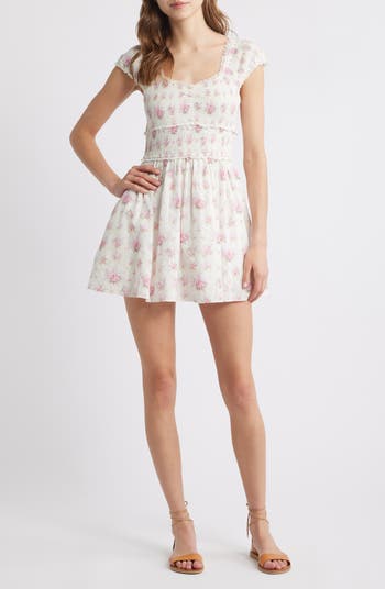 Dainty blooms dapple and all-cotton dress shaped with smocking and ready for summery outings.