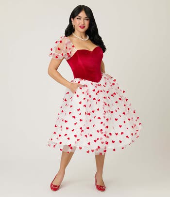 This gorgeous dress is cast in bright red satin, and white chiffon dotted with red hearts, this dress will get your heart beating fast! The fitted sweetheart bodice is framed puff sleeves, while the white & red heart chiffon skirt is draped over a white lining and layer of tulle for fabulous volume! Complete with a back zipper and side pockets!