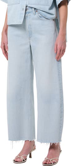 Made from soft nonstretch denim in a baggy fit, these ankle-length jeans sit low on the hips, curve out subtly at the thighs and taper to the frayed hems.