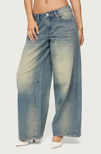 Casual yet dramatic, these nonstretch low-rise jeans get their baggy fit from knee darts that release into wide, full-length legs.