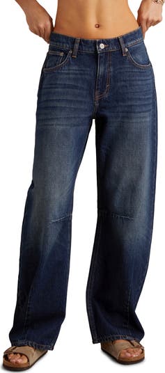 A low rise is balanced with barrel legs in these dark-wash jeans that stay crisp with no stretch.
