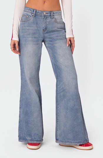 Deep sanding and a low rise add modern elements to nonstretch denim jeans fashioned with wide legs for trend-savvy appeal.