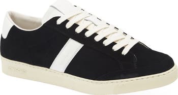 A subtly stamped logo details the contrast leather panel on this low-top sneaker crafted from velvety Italian suede.