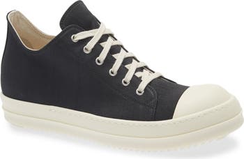Premium twill cast in a black hue kicks up the everyday versatility of a low-top sneaker set in a glossy-white cupsole and fitted with a chunky capped bumper toe.