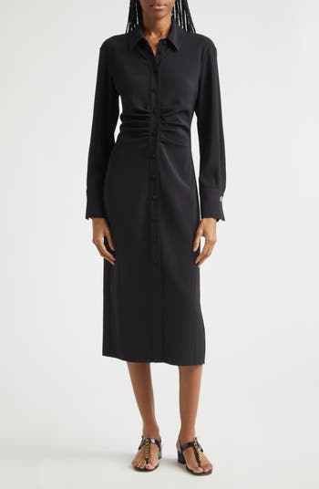 Artful ruching nips in the waistline of this figure-skimming crepe midi shut with tonal covered buttons for a vintage-inspired feel.