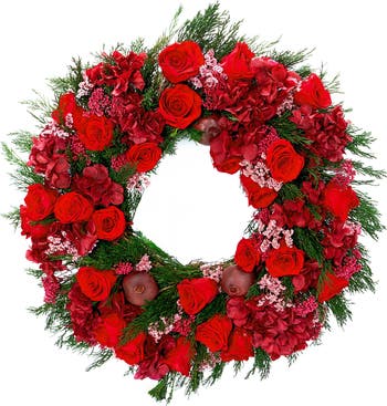 Make a striking seasonal statement with this striking, luxurious holiday wreath. The L'Étoile Rouge Grand Wreath is artfully handcrafted with 24 of the brand's signature Eternity® Roses and Eternity® Hydrangea, arranged within a lush base of cypress, juniper and evergreen. Rich crimson and deep burgundy blooms bring warmth and sophistication to any interior, from grand holiday entryways to intimate living spaces. Presented in signature emerald-and-silver celestial packaging, this wreath transforms decor into a timeless scene of beauty and celebration.