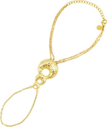 Stacked crescents with a hammered finish bring focal shine to this boho-chic hand chain plated in warm 18-karat gold or polished rhodium.