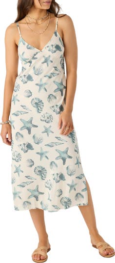 A beachy seashell pattern brightens your day every time you choose this flowy slipdress designed with airy slits at the sides.