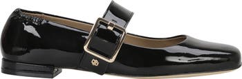 An elasticized heel counter and adjustable mary jane strap offer a comfortable and customized fit on a square-toe flat featuring a glossy leather upper.