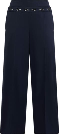 A mid-rise, relaxed fitting, wide leg pant that crops to the ankle. The front features sailor buttoning design, and side slash pockets. The button holes are highlighted in white thread. Made from a year-around weight tropical suiting fabric. Side seam invisible zipper for closure.
