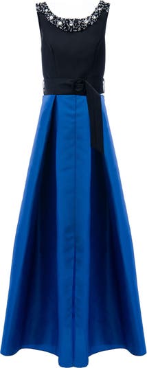 The Lucena dress is a regal and elegant piece, perfect for any special occasion. This gown features a striking black bodice paired with a strong blue gown skirt, creating a stunning contrast. The sleeveless cut provides a classic and sophisticated look. The neckline is adorned with a gorgeous gem design, adding a touch of sparkle and luxury. The long, lightweight skirt flows gracefully, ensuring ease of movement and a dramatic appearance.