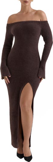 Soft ribbing shapes this shoulder-baring maxi accented with shimmering metallic threads and a stem-showing side vent.