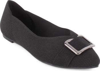 Polished bit hardware shines at the pointy-toe vamp of a sophisticated flat made with a breathable knit upper that makes it a comfy option on desk-to-dinner days.