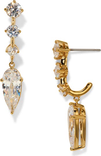 Prong-set round and teardrop-cut cubic zirconia catch the light on these gently curved hoop earrings plated in hand-polished 18-karat gold.