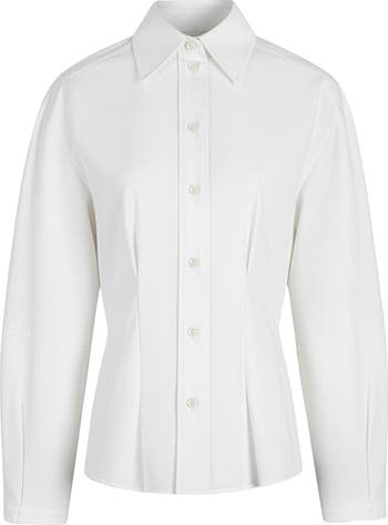 Lucia is a button front, point collar shirt with a fit and flare body shape. The sleeves feature a lantern shape.
