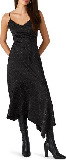 Dainty polka dots add a retro-chic flourish to this light and airy slipdress complete with an asymmetric hem.
