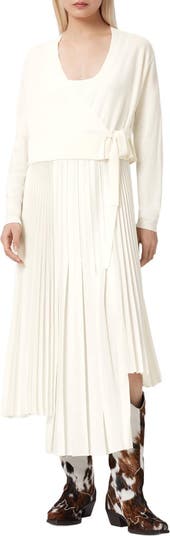 This versatile 2-in-1 dress pairs a softly draped wrap cardigan with a fluid slipdress for an effortlessly layered look you can style together or apart. The merino wool overlay meets a sleek scoop-neck silhouette with adjustable straps and an asymmetric pleated skirt for easy movement and artful edge.