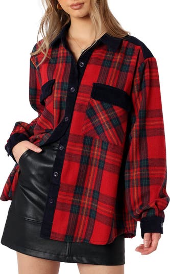 Fall for the oversized fit of this cozy plaid shacket updated with soft cord accents.