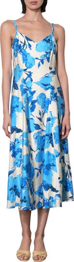 Painterly flowers bloom in bright colors on an A-line midi dress crafted from smooth satin with adjustable straps at the back.