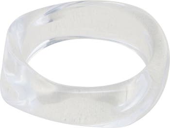 An organic-shaped bangle crafted from clear lucite invites fluid design and cool style to any look.