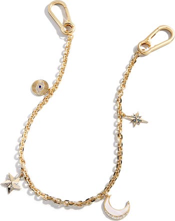 A golden chain-link strap is embellished with an eclectic assortment of charms and attaches to a favorite handbag already in your collection, draping across for an element of playful gleam.