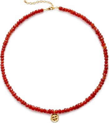 Hand-cut red onyx beads bring rich color to this necklace centered with a hammered clover pendant cast in recycled 18-karat gold vermeil.