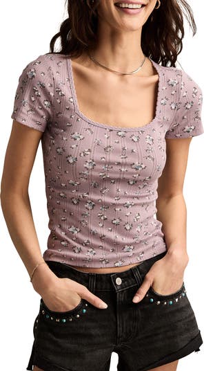 Pour on the prairie charm in this trim-fitting T-shirt made from an airy pointelle knit and printed with pretty posies.