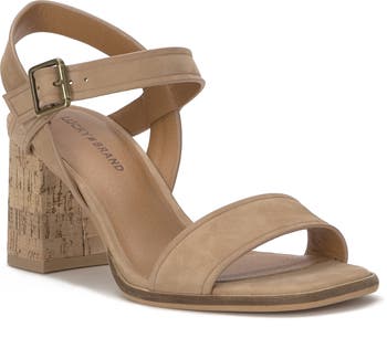 A cork-textured block heel amplifies the earthy style of this versatile ankle-strap sandal.
